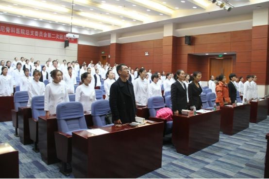 全体团员代表起立奏唱团歌,共青团北京德尔康尼骨科医院总支委员第二次团员大会胜利闭幕。