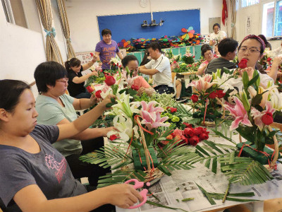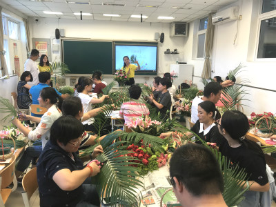 活动中,花艺师首先用妙趣横生的语言为大家详细讲解了插花花材的识别、色彩的搭配、东西方插花特点、不同花材的花语和送花的禁忌及注意事项等知识,并现场进行了插花的操作展示,指导老师们制作插花作品。在轻松愉快的氛围中,老师们结合花材的特点从取材、剪叶、构图开始,不断的尝试和实践,兴致盎然的完成了各自的插花作品。