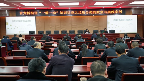 1月10日下午,青龙桥街道邀请零废弃联盟政策主任谢新源讲授垃圾分类的政策与实践案例,街道、社区党组织和团组织的党员、团员100余人参加培训。