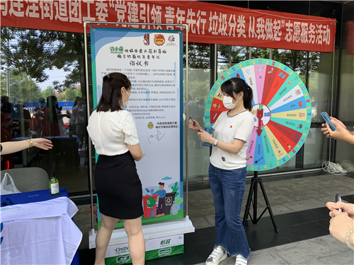 仪式现场还设立了垃圾分类知识宣传展板,并设置了有奖竞猜环节和垃圾分类大转盘游戏互动环节,增加了活动的趣味性和吸引力,在宣传垃圾分类知识的同时,发动广大青年朋友积极参与垃圾分类志愿服务活动。
